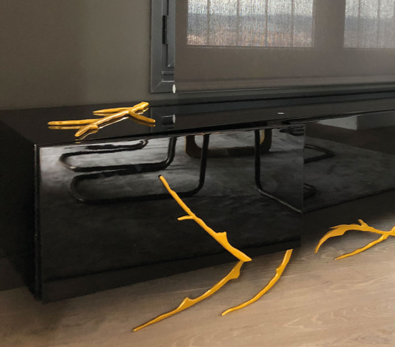 Mesa de comedor en lacado negro alto brillo con patas metálicas forjadas a medida y lacadas en tonos metalizados a juego con aparador y mesas auxiliares.