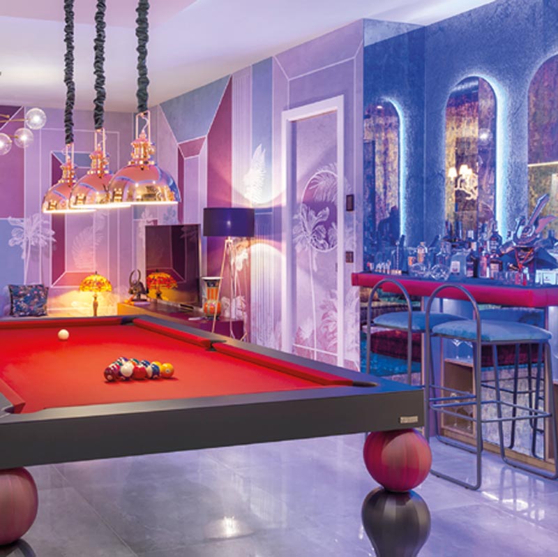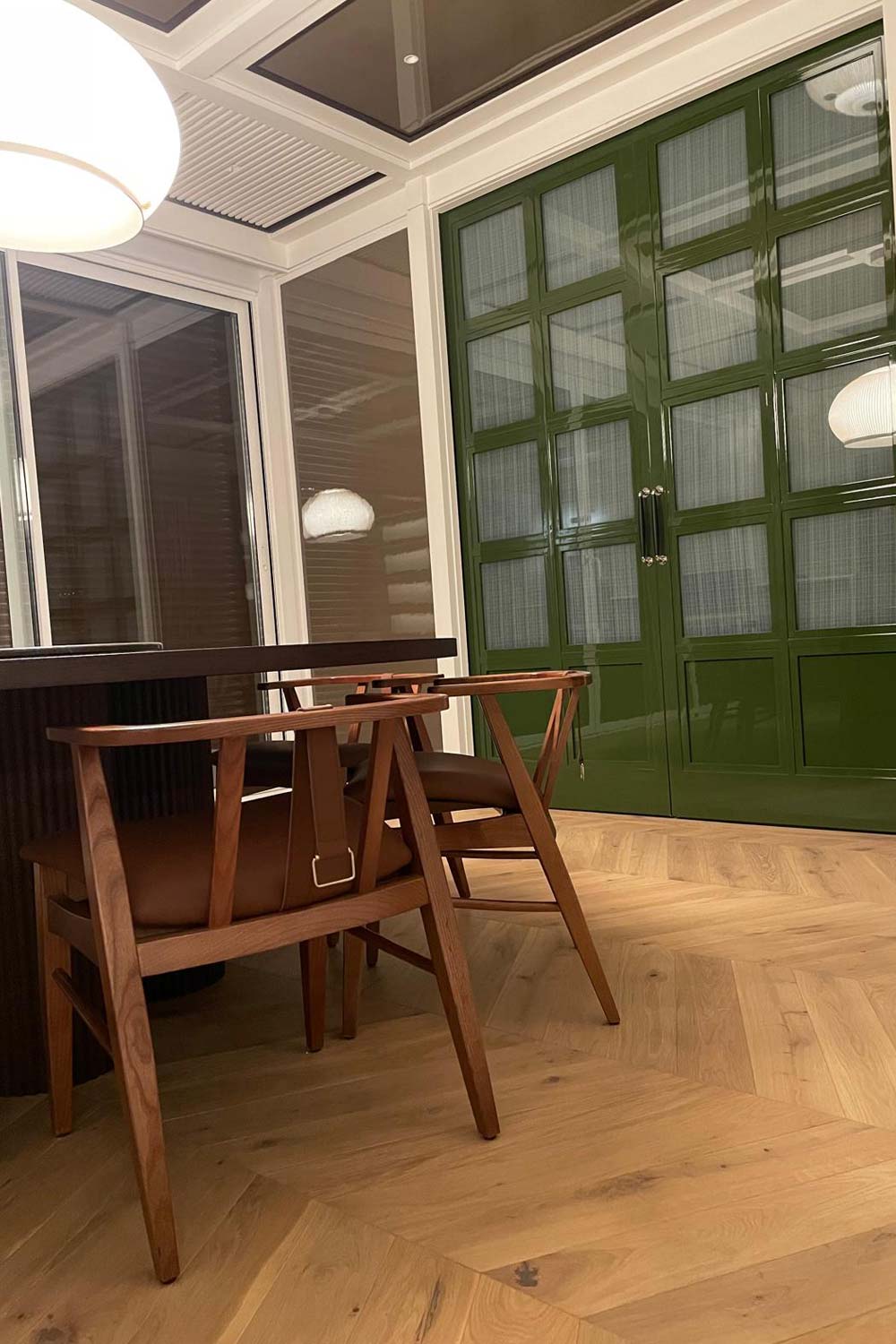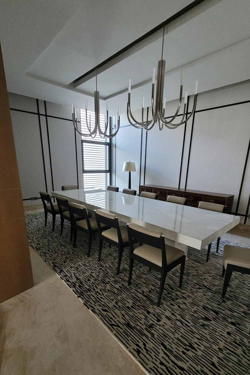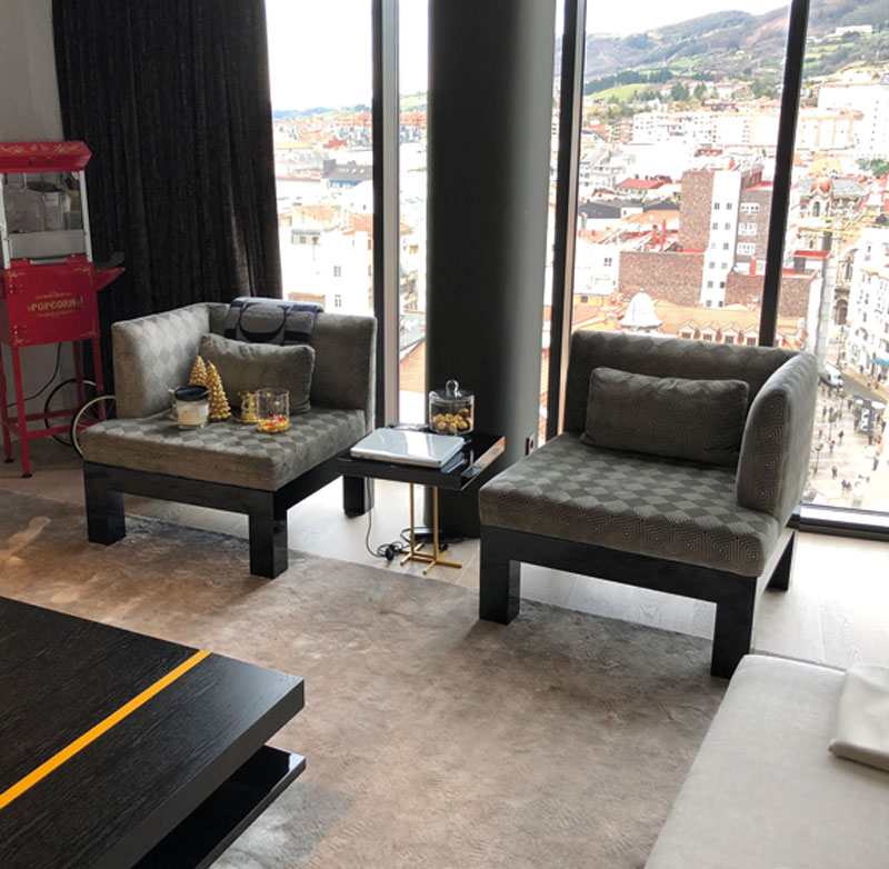 Mesa de comedor a medida en madera con sillas tapizadas y soportes metálicos a medida. Mesas de centro con formas redondeadas en madera y acabados metálicos efecto espejo.