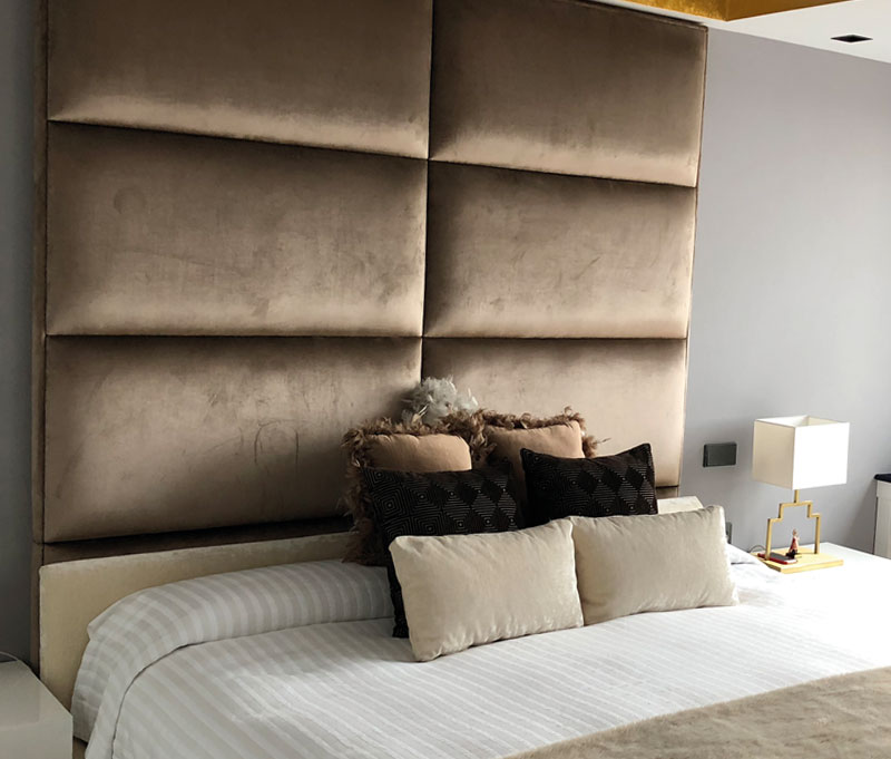 Cabecero y estructura de cama con tapizado acolchado en diferentes tejidos a medida.