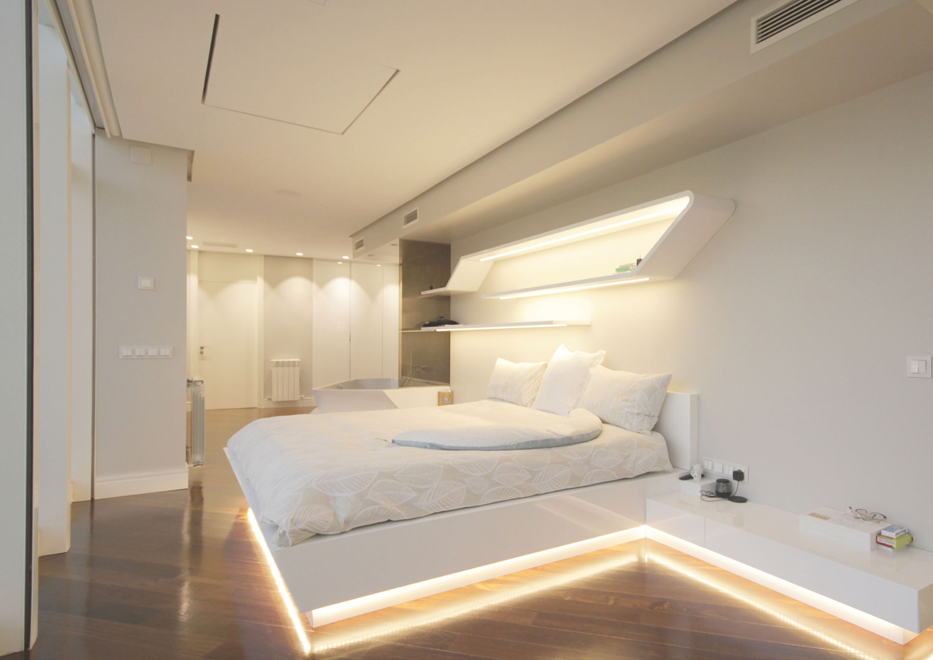 Dormitorio con estructura de cama a medida en laca brillo con led inferior. Estantería con formas redondeadas y led integrado.
