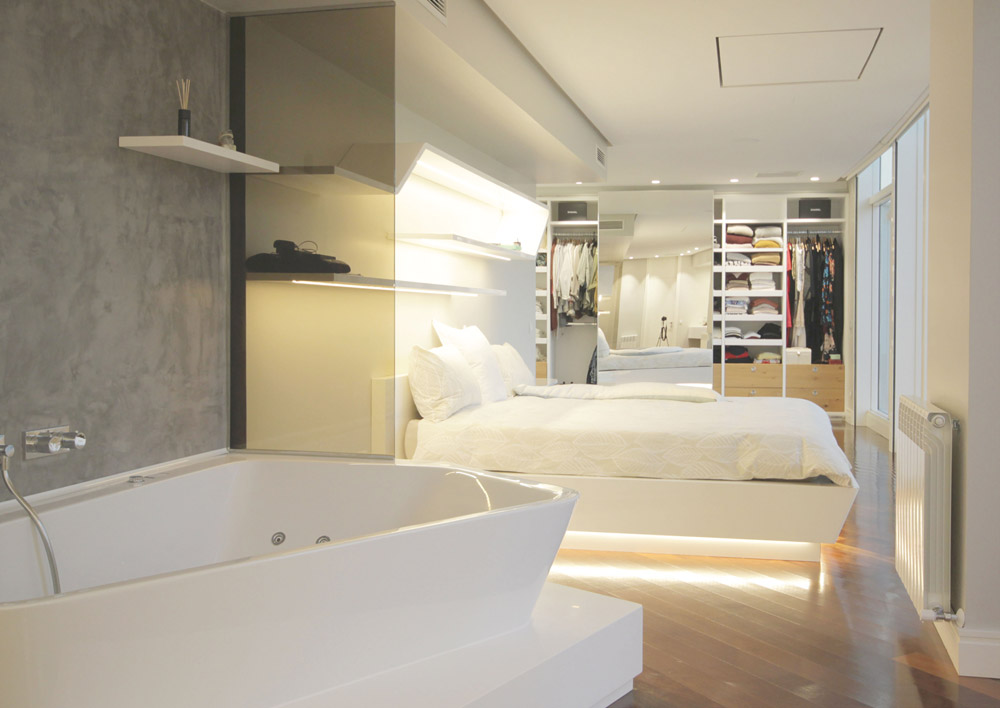 Desarrollo de mobiliario a medida para dormitorio en laca brillo e iluminación integrada.