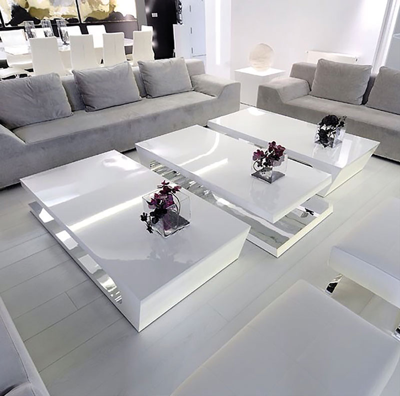 Desarrollo de mesas de centro a medida con exterior en laca brillo e interior en forma curvada y lámina de micras metálicas efecto espejo.