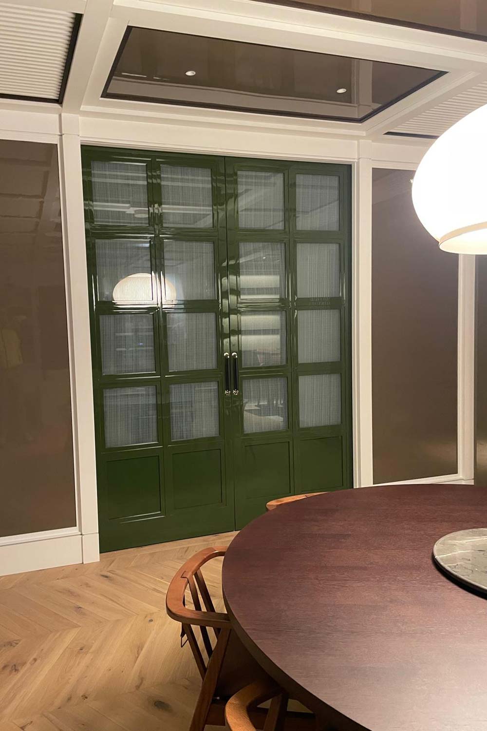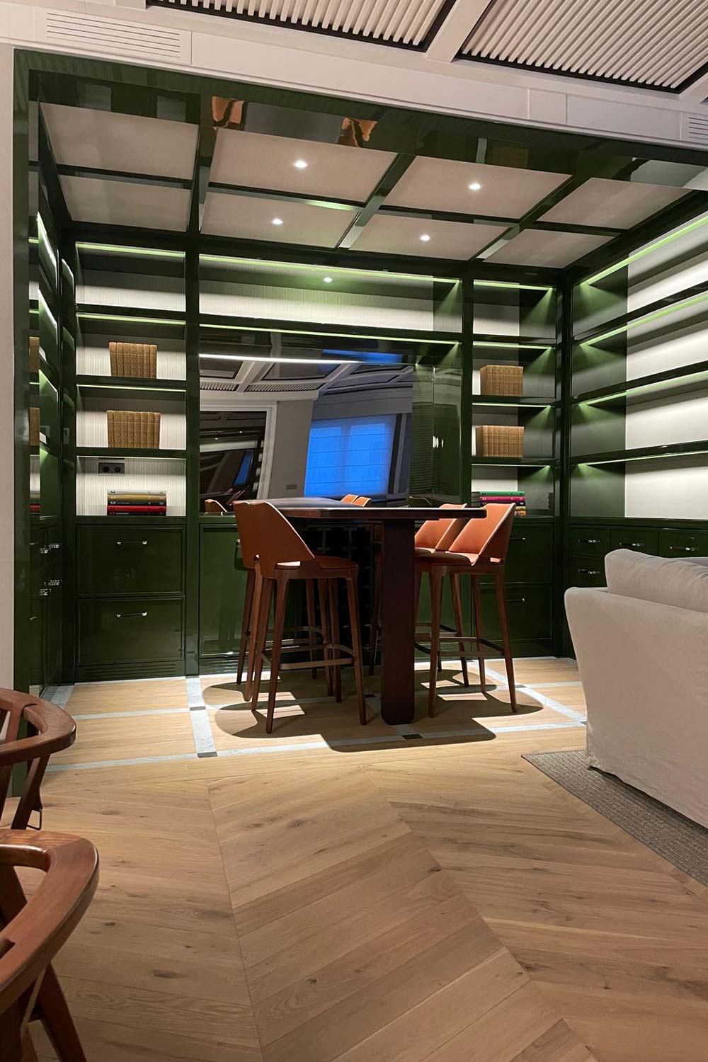 Desarrollo de mobiliario para interior realizado a medida y revestimientos en paredes y techo. Puerta corredera y librería con lacado de color alto brillo. Mesa con taburetes y mesa de comedor redonda y librería con chimenea.