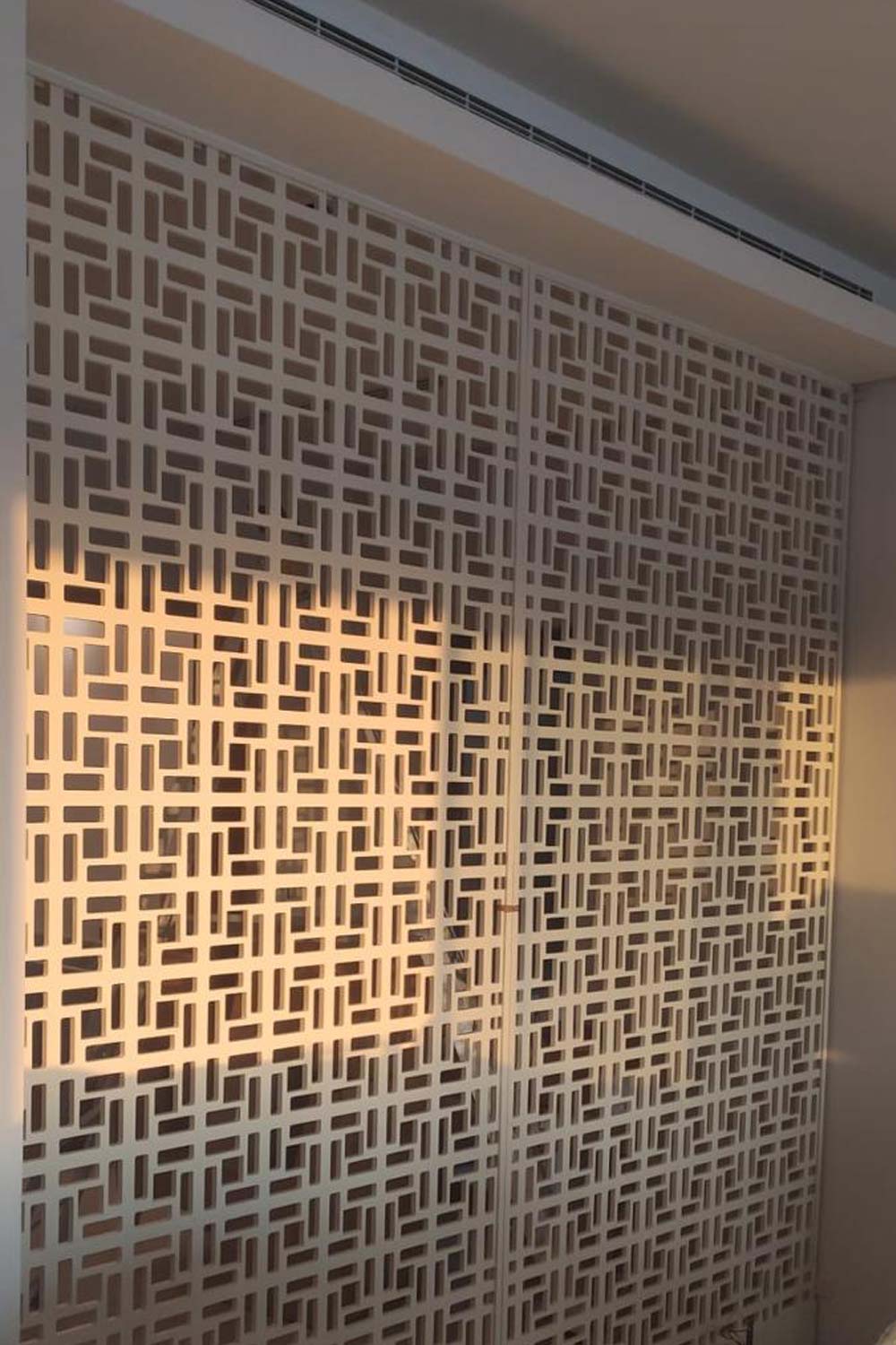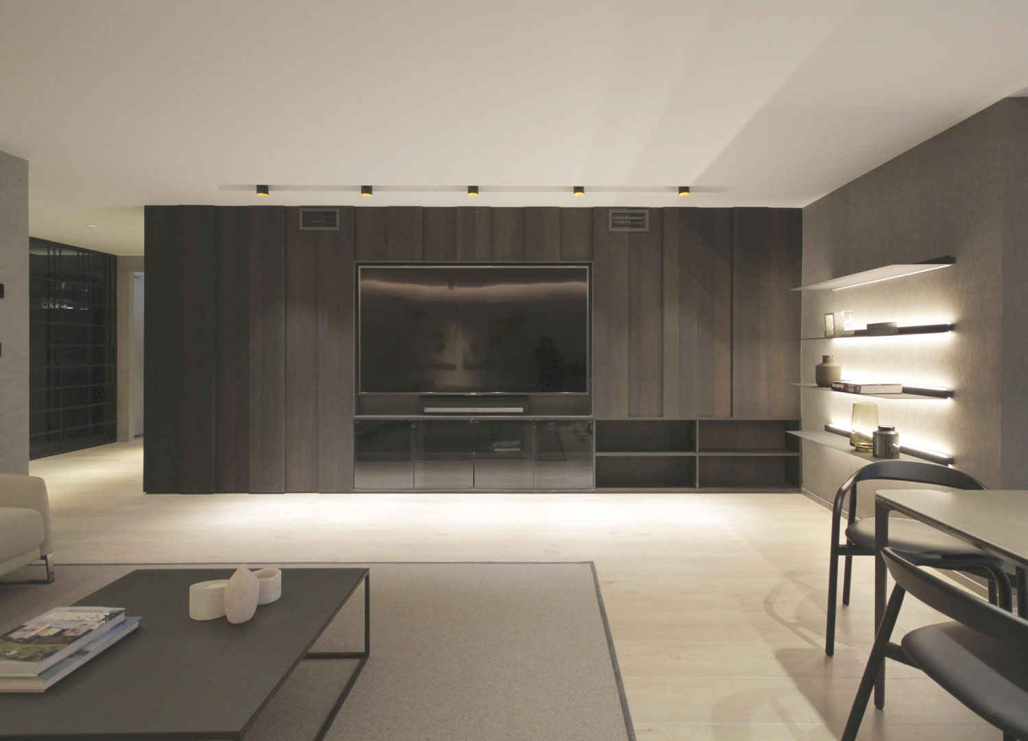 Desarrollo de panelado a medida que funciona de separador de ambientes e integra zona de aparador y mueble de tv. Acabado en madera y puertas de vidrio.