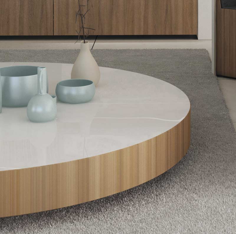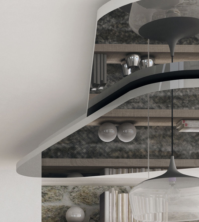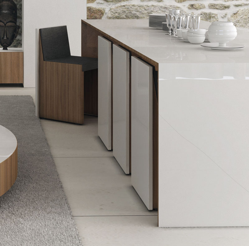 Mobiliario para lobby de hotel hecho en madera natural, estructura metálica lacada y y estantes efecto espejo.